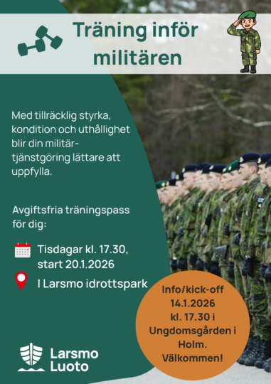 Militräningen drar igång med ett infotillfälle nästa vecka. Larsmo IF kommer att hålla i några av vårens träningar. Mer detaljerad info ges senare.